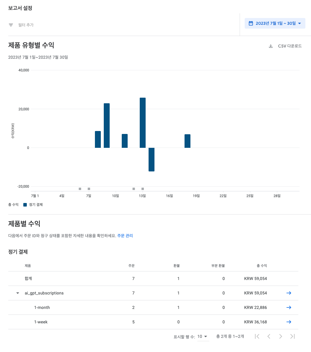인앱결제 수익은 많은 결제가 이뤄졌으나 생각보다 많은 사람들이 결제 취소하기 시작하며 수익이 쪼그라 들었다. 취소를 하지 않았다면 약 20~30만원의 결제가 이뤄졌지만 취소합계를 제외하니 약 59,000원의 수익이 발생하였다. (세금 떼면 아마 더 줄어들지도) 결제 취소가 많다는건 앱의 컨텐츠가 구매로 이뤄져서 만족감을 줄만큼은 아니라는 증거라 판단이 되어 앞으로 추가적인 컨텐츠나 재미요소(사용자에게 가치를 줄 수 있을만한)들을 추가개발할 예정이다.