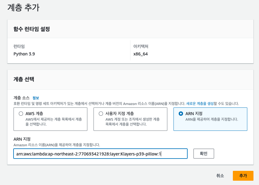 ARN으로 지정하고 레이어를 추가해줍니다. 저는 python 3.9 버전을 기준으로 사용하였고 각자 파이썬 버전에 맞는 버전을 찾아서 ARN을 추가 해주시면 됩니다. (참고링크)