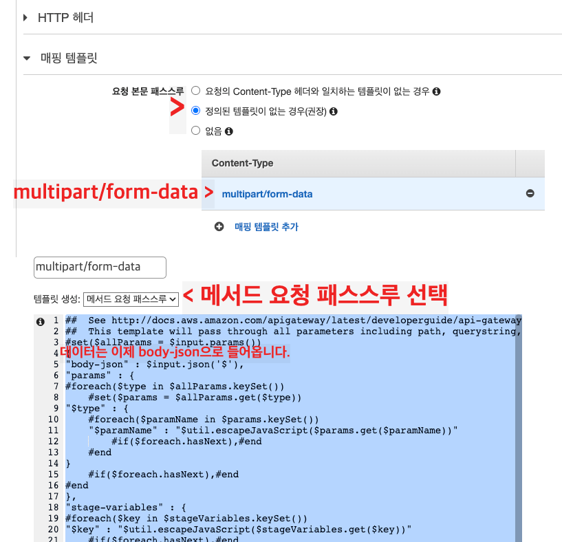 API Gateway에서 multipart/form-data를 받을 수 있게 추가 설정을 해주도록 합니다.