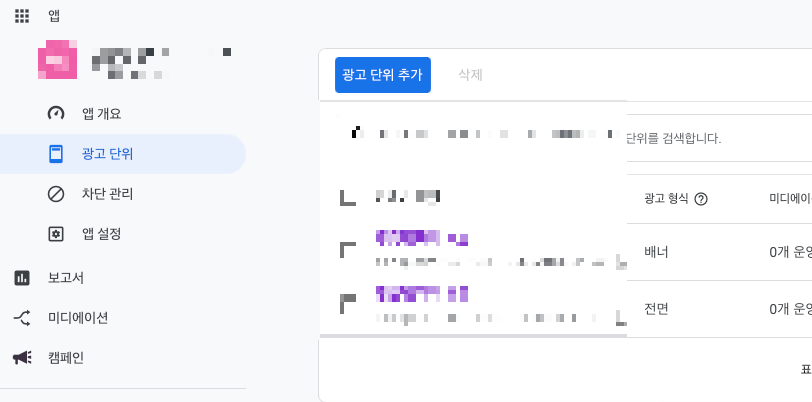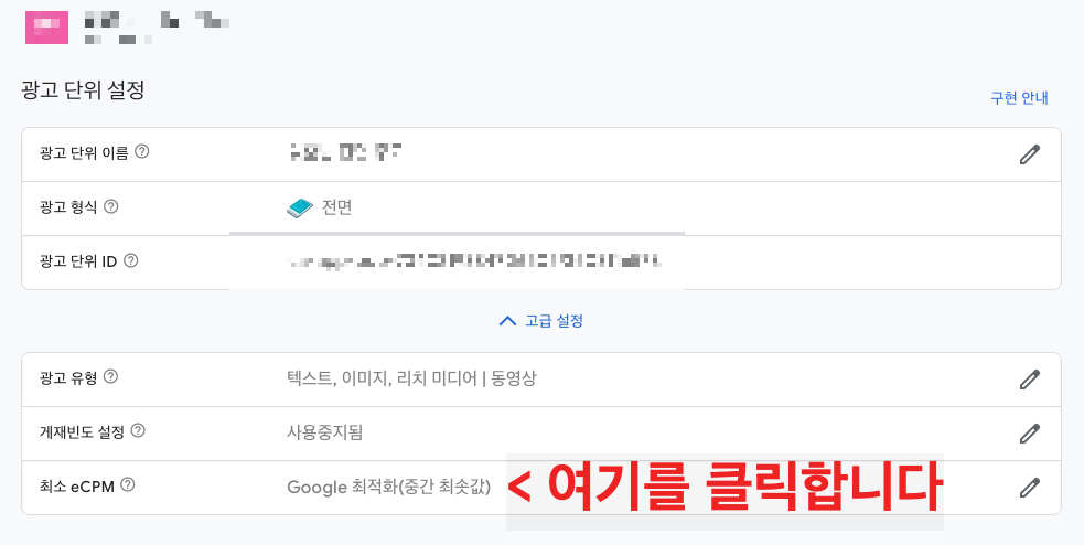 3. 위에 표시된 앱의 경우 배너광고 1개, 전면광고 1개가 있는데 eCPM을 올리고자 하는 광고를 선택합니다.