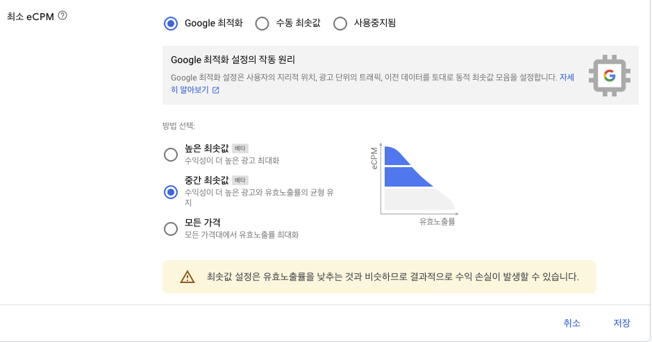 기본적으로는 아무 설정도 하지 않았다면 모든 가격이 기본으로 설정 되어있습니다. 그래프에도 나와있지만 여기서 높은 최솟값을 선택하면 eCPM의 단가가 높은 광고만 받겠다라고 선언하는 것인데, eCPM의 단가가 높아져서 광고 수익이 늘어날수도 있지만 반대로 생각하면 eCPM의 단가가 높지 않은 광고는 받지 않겠다고 선언하는것이니 항상 높은 단가의 광고만 존재할 수 없기에 광고 노출률이 떨어지게 됩니다. 중간 최솟값은 적당한 균형을 찾아서 중간 eCPM 정도 되는것 까지는 광고를 받겠다라고 하는것이구요.