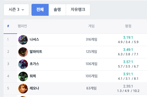 - 20대에는 정말 모든 게임에 미쳐있었다. 하루 최소 5시간~8시간을 게임만 했으며 정말 많이 할때는 24시간 잠을 안자고 날밤새는 경우도 많았는데 밥도 컴퓨터 책상위에서 대충 김밥이나 라면으로 떼우며 게임에 열정을 다했었다. op.gg에서 검색 해보니 시즌 2부터 시즌 6까지 매 시즌마다 게임을 500~1000판을 한걸로 나온다. ㄷㄷㄷ..