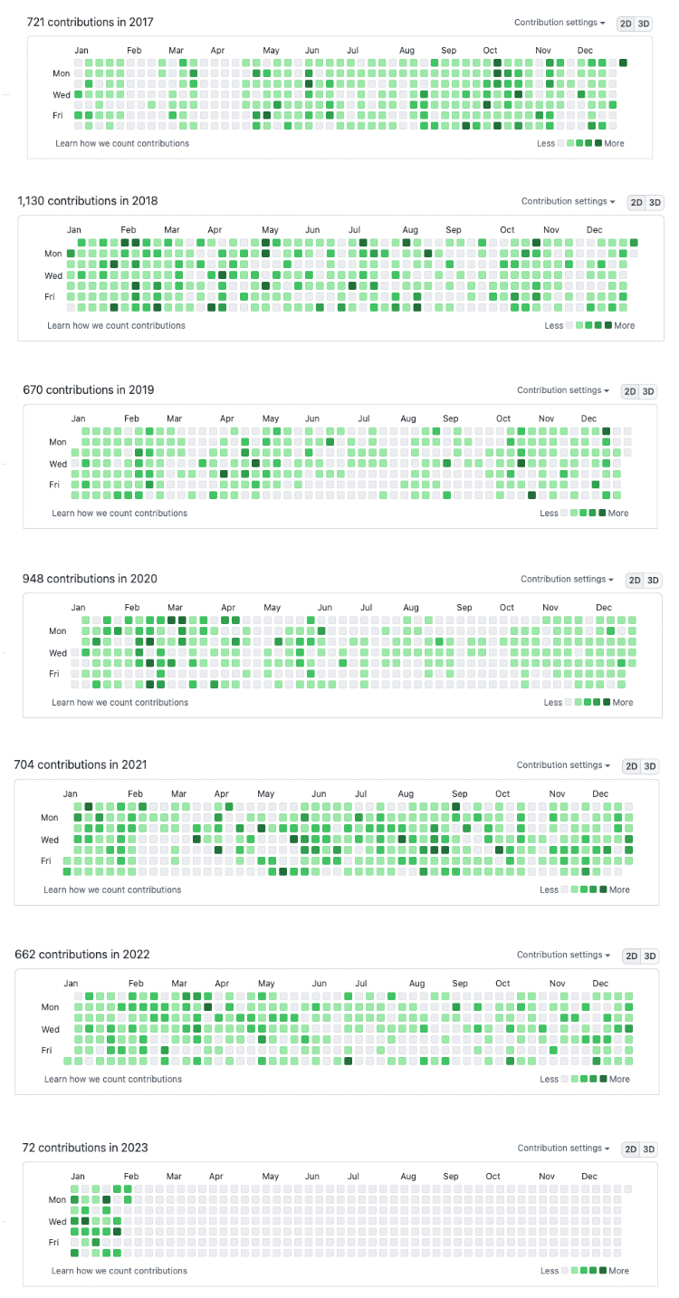 아기가 태어나기 전까진 퇴근후 밥먹고 운동하고 남는 시간에 꾸준히 조금식 이라도 코딩을(부업을) 하는것이 엄청난 열정과 에너지를 쏟는 일이라 생각했다. 왜냐하면 보통은 일을 마치고 추가로 부업이나 자기개발을 하지 않기 때문이다. 올해초에 올린 글에서 캡쳐한 깃헙 그래프인데, 그동안 이정도 했으면 정말 열심히하지 않았나? 라는 스스로의 위안을 했던것 같다.