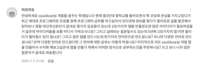 안녕하세요! 프로그래밍좀비 입니다. 최근 블로그 포스팅에(https://soulduse.tistory.com/106#comment20129916) 한 중학생 분의 질문을 받게 되었고, 질문의 내용이 괜찮은듯하여 이에 대한 제 답변을 정리 & 공유하며 앱 개발에 대한 궁금증을 해결해보고자 합니다.
