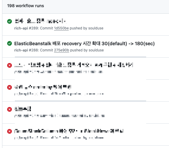 GithunAction + ElasticBeanstalk 조합으로 서버 코드 배포 자동화를 해놨는데, 이게 간헐적으로(매우 높은 확률로) 아래와 같이 흘러가다가 GithubAction 상에서 에러로 남아 있는게 아닌가..!