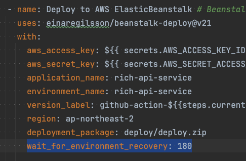 현재 github action 내용중 ElasticBeanstalk 관련된 부분은 아래와 같았는데,