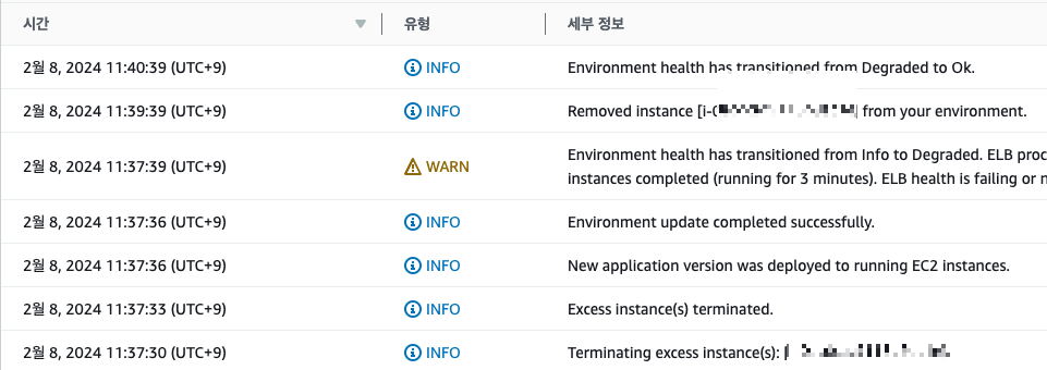 GithubAction 상에는 에러로 남아있지만 실제로 ElasticBeanstalk을 들어가보면 아래와 같이 정상적으로 배포가 되었음을 볼 수 있었다.
