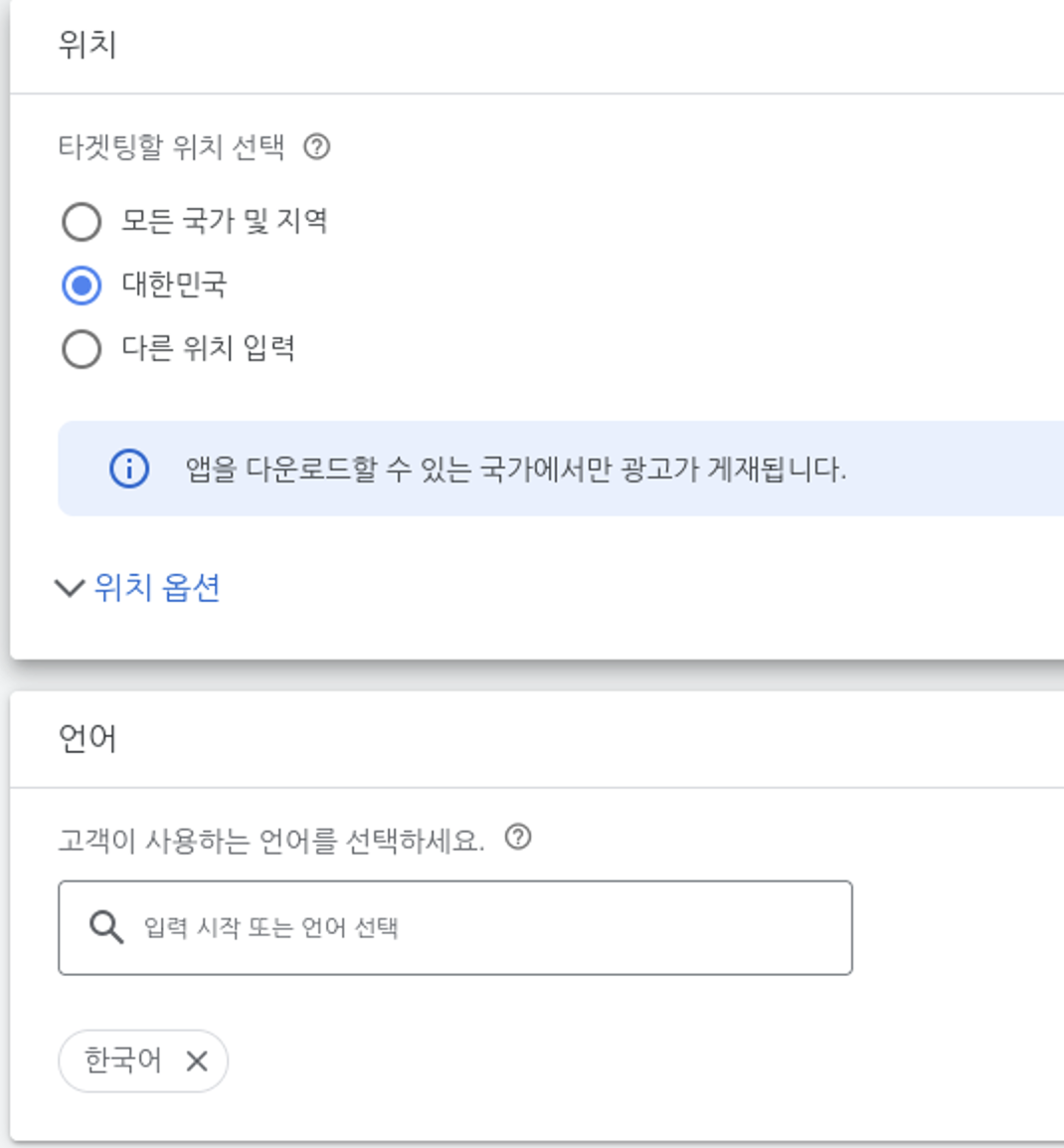 내가 만든 앱의 타겟에 맞춰 위치와, 언어를 선택하도록 합니다. (많이 선택하는게 오히려 안좋을 수 있어요 하나씩 해보며 효율을 체크 합시다.)