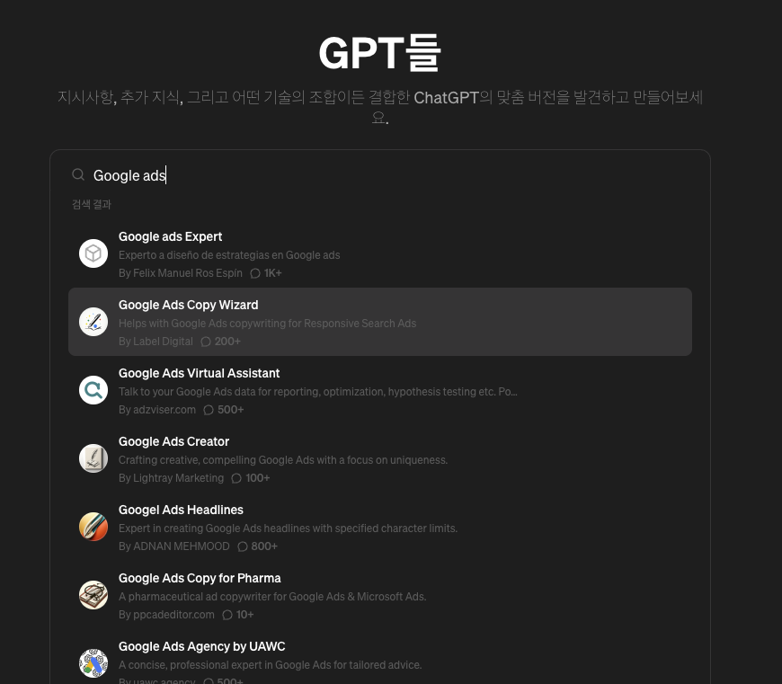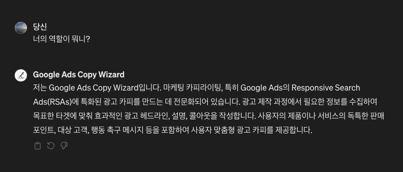 - 저의 경우 다양한 GPTs를 만들어두고 사용하는데 Google Ads 관련해서도 그것만을 전문적으로 하기위한 GPTs를 만들어두고 사용하고 있습니다.