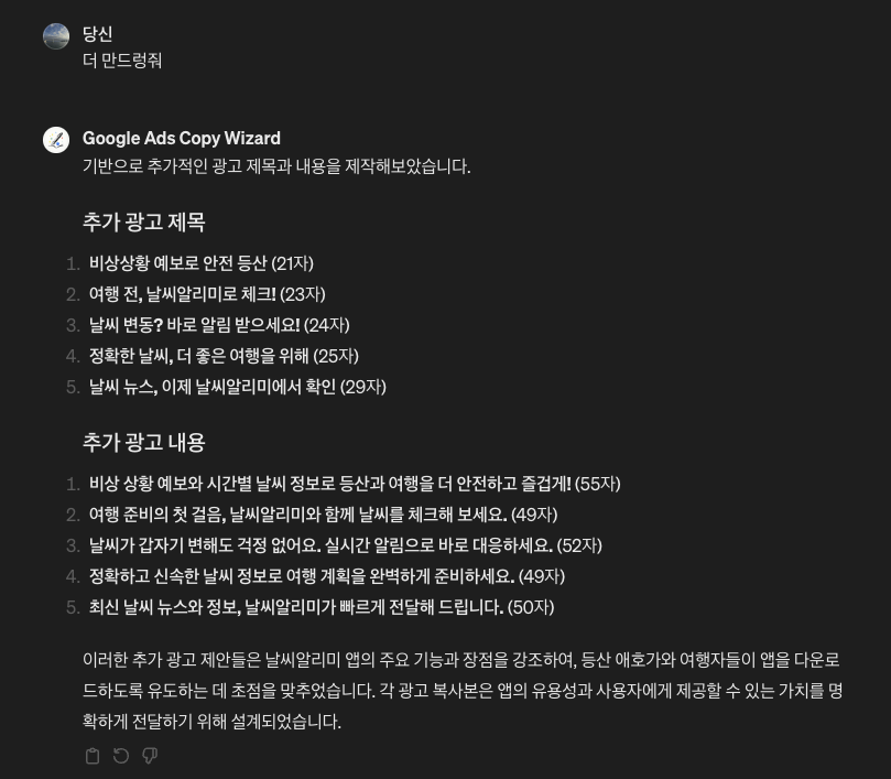 꽤나 나쁘지 않은 광고 제목과 내용이 뽑혔습니다. 글자수 나오는건 직접 확인해보니 오른쪽에 적힌 것 처럼 정확히 글자수가 일치하진 않네요 ^^;; 그래도 쓸만합니다. 만약 뽑혀진 광고 내용이 마음에 안든다면 더 만들어달라고 하면 마음에 들때까지 광고 내용을 뽑아줍니다. 이제 손쉽게 광고 제작을 해보자구요!