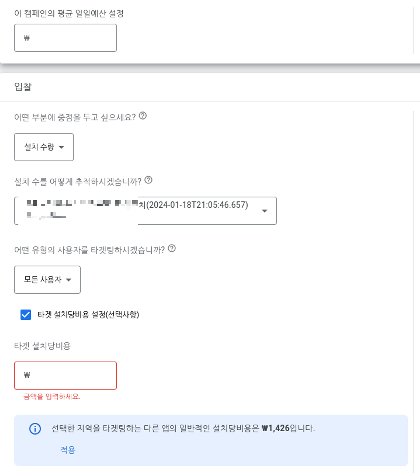 - 타겟 설치당비용 : 설치당 얼마를 지불 할 것인지