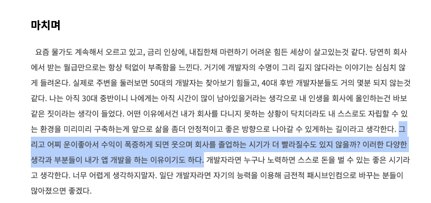 지속적인 의심과 불안 속에서의 여정2023. 2. 7 당시 회사다니며 개인앱을 개발 병행을 오래했다. (당시 기준 약 5년 가량)대부분의 주변 개발자들은 좋은 회사 취직하기 위해 또는 몸 값을 올리기