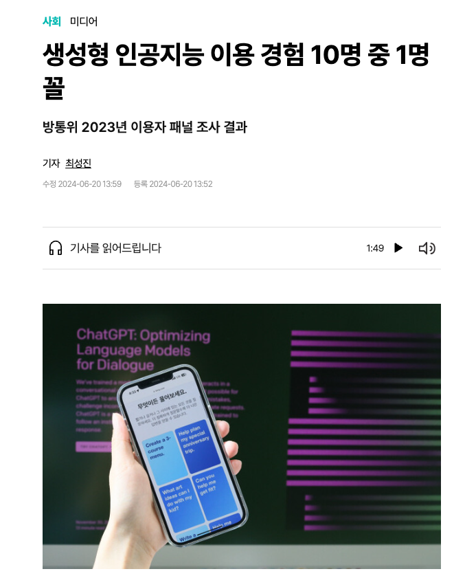 2024. 06. 20일 기준으로 ChatGPT, Claude와 같은 서비스를 이용해본 사람들은 아직 10% 정도 밖에 되지 않는다고 합니다. 그말은 즉 아직은 기회가 많다고 봐도 되지 않을까요? 전국민이 100% 인공지능 서비스를 모두 잘 활용하고 있다면 😂 또 어떤 상황이 펼쳐질지 모르겠네요. 모두가 개인 서비스를 내고 모두가 경쟁자가 되어 치열한 전쟁터가 되지는 않을지..