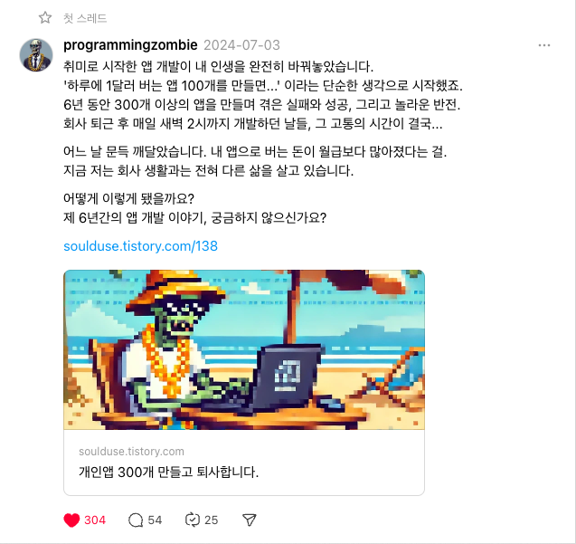 위와 같은 심리 상태였던것 같습니다. 진심을 담아 글을 작성했고, 저 글이 제 인생 두 번째 변환점의 시작이었습니다. 감사하게도 많은 분들이 응원과 격려 그리고 질문을 해주셨고 거기에서 힘을 얻어 마음속에 불안함을 이겨내고 계속해서 나아갈 수 있었습니다. 그렇게 저는 포기하지 않고 계속해서 개인앱 개발을 이어갔고, 그렇게 1인 개발자, 5년동안 개인앱 150개 이상 만들기 글을 쓴지 약 1년이 조금 넘은 시점인 24년 6월 개인앱 약 300개를 출시하고 퇴사를 할 수 있게 되었습니다.