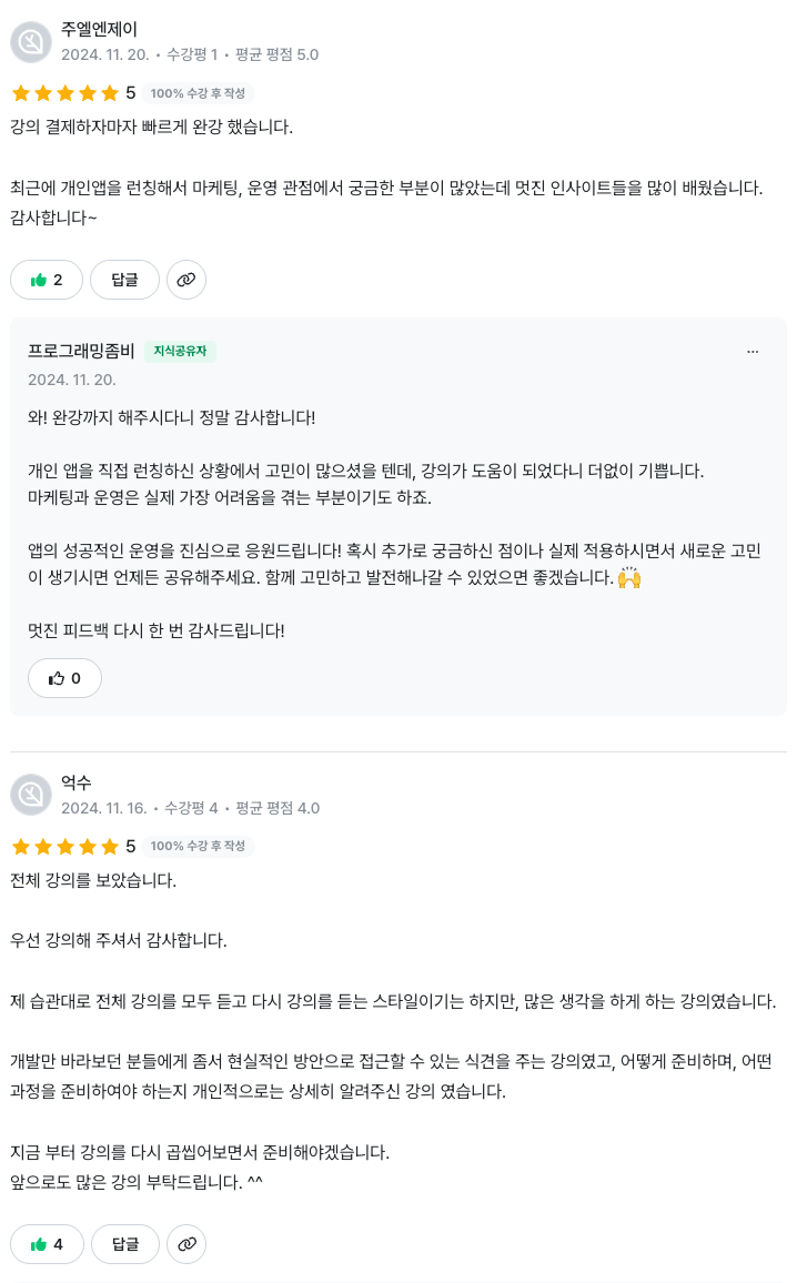 개인앱 개발은 어쩌면 제가 겪어온 삶과 같이 정말 외로운 길일 수 있습니다. 그동안 정말 말도안되는 수준의 많은 시간을 갈아 넣었고, 현재 24년이 끝나가는 현 시점 약 350개 이상의 앱을 출시하였지만 망한 앱이 80% 이상이라 할 수 있습니다. 하지만 이러한 과정 속에서 정말 값진 것들을 많이 배우고 내 것으로 만들 수 있었죠. 예전부터 누군가를 가르쳐 본적은 없지만 만약 가르치게 된 다면 이런걸 알려줘야겠다 마음속으로만 생각한 것들이 많았는데 이번에 좋은 기회를 얻어 제가 가진 지식과 경험을 모두 정리해보는 시간을 가질 수 있었고 이를 영상으로 만든, 강의 또한 출시할 수 있었습니다.