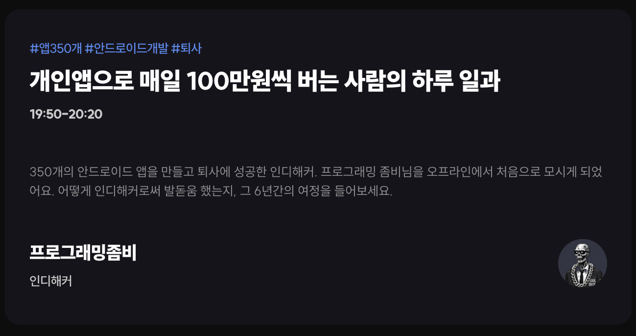 강연 연사로서의 경험은 정말 특별했습니다. 제 경험과 지식을 다른 분들과 나누는 과정에서, 제가 걸어온 길이 누군가에게 영감이 될 수 있다는 사실도 깨닫게 되었고, 저 또한 과거 참여한 컨퍼런스에서 영감을 받아 현재에 다다를 수 있었기에 참여해주신 분 중 누군가는 저와 같이 제 2의 프로그래밍좀비가 되면 좋겠다는 생각이 들기도 했습니다. 퇴근 시간을 뚫고 참여해주신 많은 분들께 그리고 주관해주신 조쉬님과 함께 해주신 재호님, 빈센트님께도 감사의 말씀 드리고 싶습니다. 👏🙏