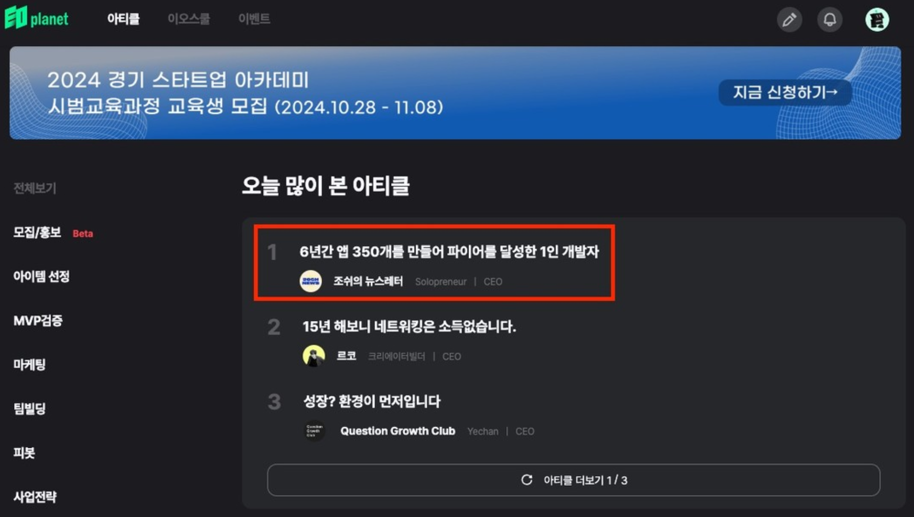 그렇게 처음에는 커피챗을 시작으로, 글쓰기로 유명하신 조쉬님과 인터뷰도 진행하였고 인터뷰한 글은 조쉬의 뉴스레터와 EO planet에 게재되었습니다. 해당 글은 꽤나 오랫동안 EO planet에서 오늘 많이 본 아티클 1위에 머무르는 기염을 토해냈습니다.