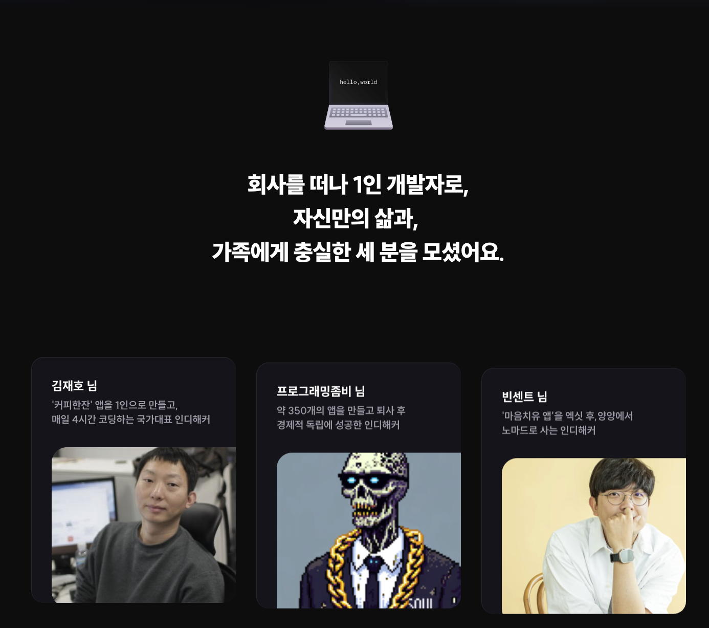 1인으로써 스스로 만든 앱을 개발하여 독립에 성공한 3명의 특별한 개발자를 모셨어요. 이들이 지향하는 라이프스타일, 솔로프리너로써의 삶을 들어보세요.