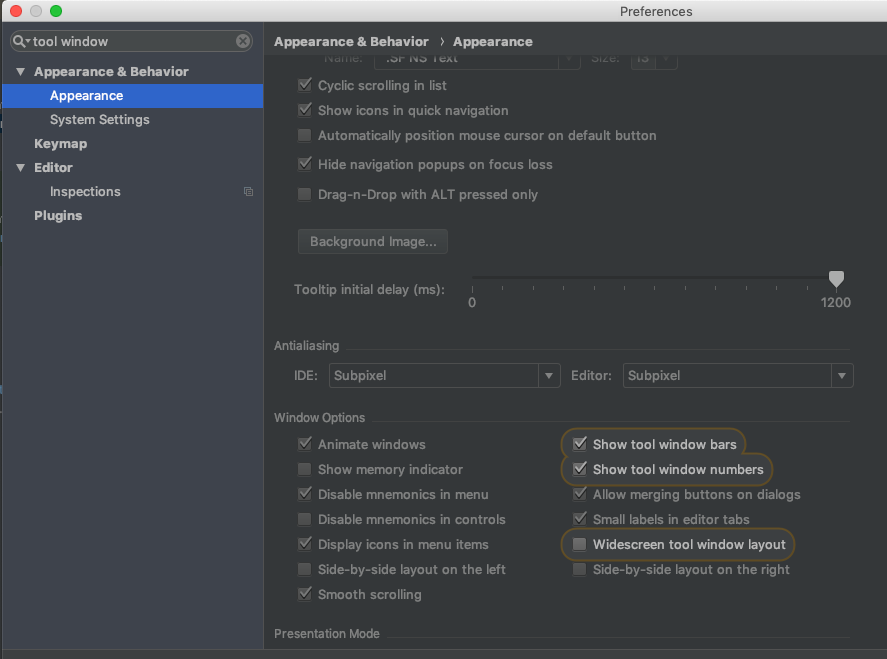 설정에서 tool window를 검색 > Appearance & Behavior > Appearance > Show tool window bars 체크