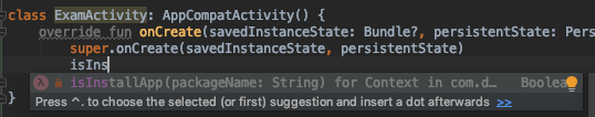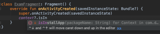 코틀린에서 확장함수를 사용하는 걸 좋아한다. 코드에보면 fun Context.market(..), fun Context.openApp(..)과 같이 Context를 확장한 함수를 볼 수 있는데 저렇게 사용하면 Context영역 아래에서 함수를 바로 사용할 수 있다. 무슨 말이냐면 아래의 코드를 보면 바로 이해가 될 듯하다.