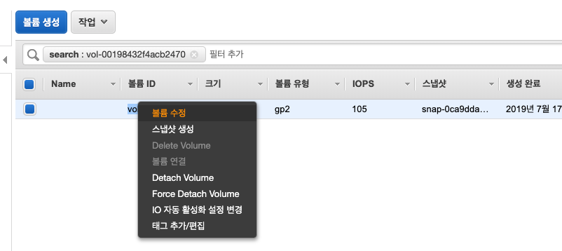 - 수정하고자 하는 볼륨 우클릭하고 볼륨수정 클릭