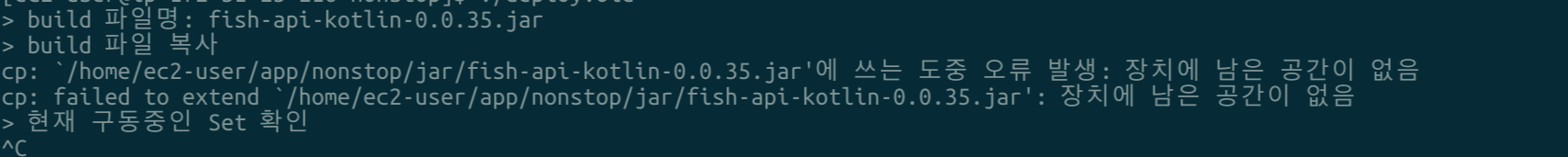 서버에 무엇인가 문제가 있어서 배포를 하려고 보니 장치에 남은 공간이 없다는 에러메세지가 뜨고 있는 상황이었습니다.