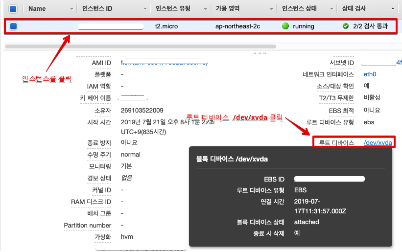 - 용량을 늘리고자 하는 EC2를 선택 > 루트 디바이스 /dev/xvda 클릭