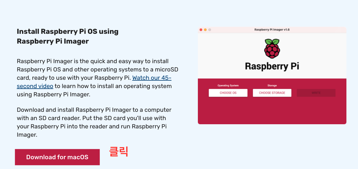 1. Raspberry Pi 공식 홈페이지 이동 https://www.raspberrypi.org/software/ 하여 Download for macOS 버튼을 눌러서 파일을 다운 받습니다.