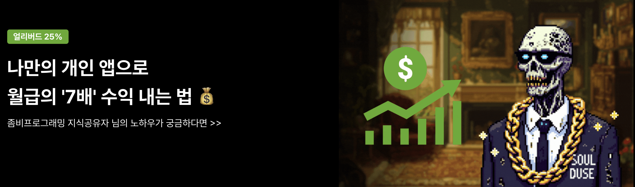프로그래밍좀비 강의 350개의 개인 앱을 만들어 월급의 7배 수익을 달성한 방법 개인앱으로 월급의 2~7배를 벌게 된 7년간의 여정과 노하우를 모두 담았습니다. 강의로 시간과 노력을 레버리지 하세요! 보러 가기 인프런 강의 출시! 2024. 11. 17. https://inf.run/4U2KE 350개의 개인 앱을 만들어 월급의 7배 수익을 달성한 방법 강의 | 프로그래밍좀비 - 인프런 프로그래밍좀비 | 350개의 앱을 통해 월급의 2~7배를 벌게 된 7년간의 여정과 노하우를 모두 담았습니다. 이제는 당신이 그 주인공이 될 차례입니다., 하루 4-5시간만 자면서 350개의 앱을 만들어월 www.inflearn.com 반응형 공유하기 게시글 관리 프로그래밍좀비